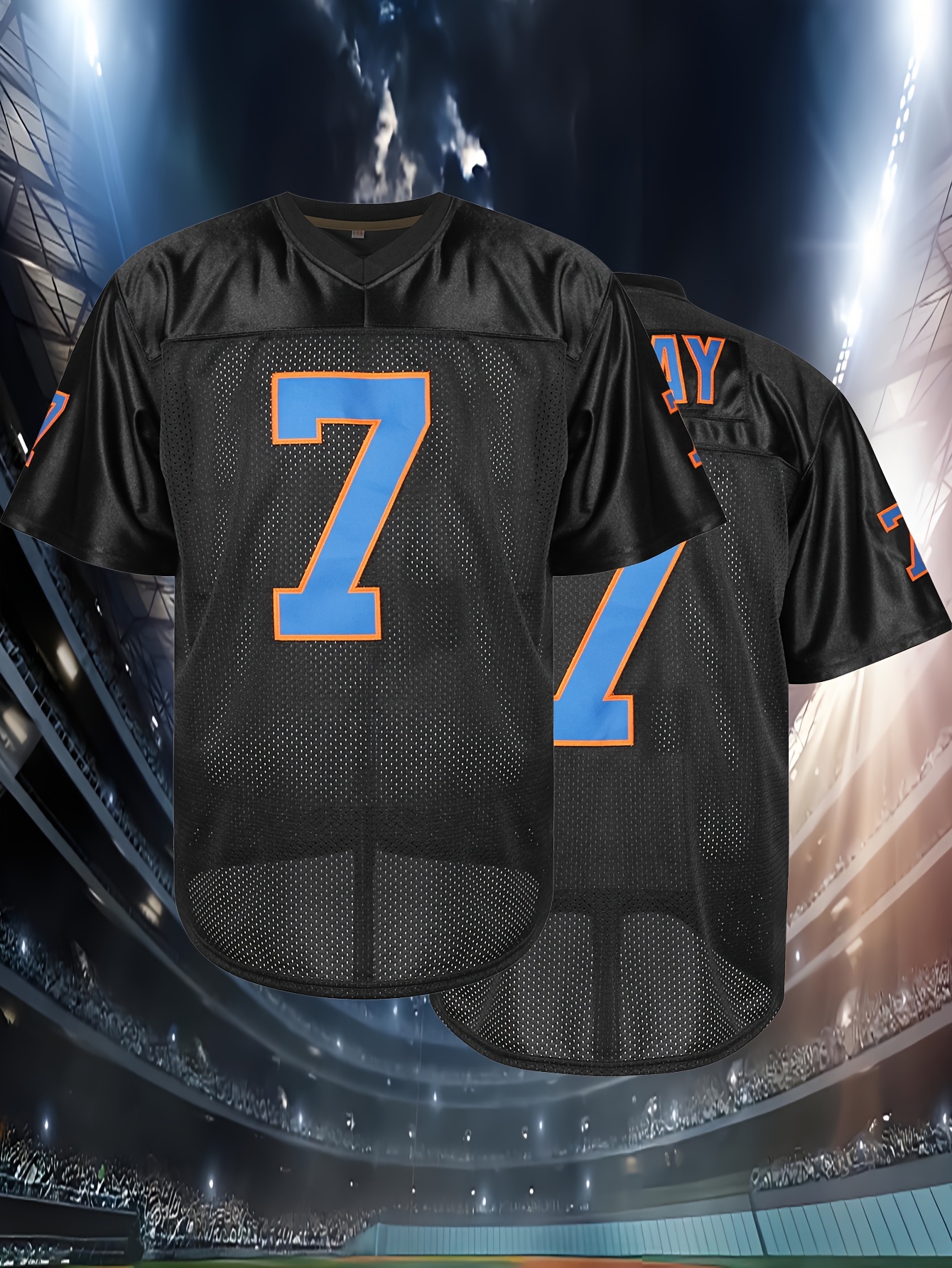 Men's #7 NYC Rugby Jersey - Breathable & Comfortable V-Neck Sports Shirt for Training, Casual Wear & Outdoor Activities, Sizes S-3XL, Black with Orange & Blue Accents